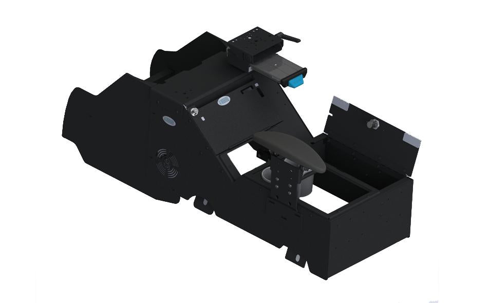 The new 2021+ Chevrolet Tahoe Wide Body Console Box Kit with Internal Printer Mount, Armrest, Cup Holder, and Mongoose® XE 9" Motion Attachment maximizes mounting space while the locking side pocket secures valuables. Available Now